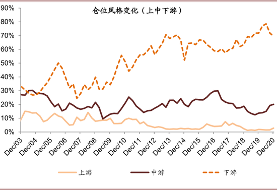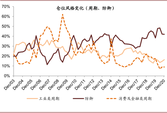 2) 新老经济仓位更为均衡。去年三季度开始的新老经济再平衡特征在第四季度继续延续。新经济重仓仓位从三季度的79%下降至77%,行业间仓位有所分化,其中重仓仓位降幅较为明显的行业包括电子、计算机、传媒互联网等TMT板块以及医药板块,如立讯精密、歌尔、信维通信、华兰生物、沃森生物等在四季度基金减持家数较多;食品饮料板块仍在继续加仓,五粮液、贵州茅台、泸州老窖四季度基金增持家数较多。老经济板块中,有色金属、化工、保险、机械等板块重仓仓位有所提升,中国平安、华友钴业、赣锋锂业、三一重工、万华化学等在四季度基金增持家数较多。四季度的市场风格也对应着主动偏股型基金在仓位上的调整。