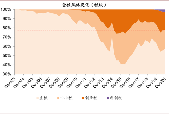 1) 主板、创业板、科创板加仓,中小板减仓。科创板仓位自2019年开板以来重仓仓位持续提升,至2.6%;创业板在去年三季度明显减仓后,四季度仓位略有回升。