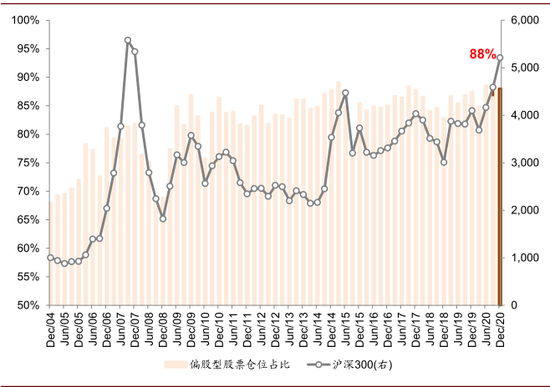 主动偏股型基金延续高仓位。主动偏股型(普通股票型加偏股混合型)基金的仓位去年四季度继续维持在88%的历史相对高位。