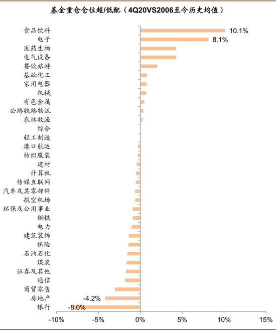 图表: 基金重仓仓位超/低配情况(当前/历史均值)
