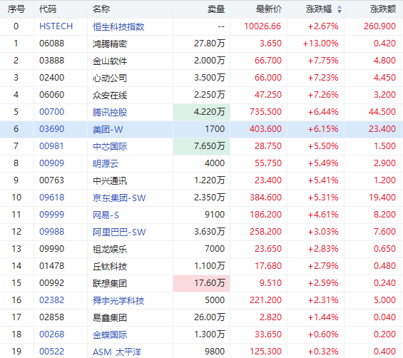 截止发稿,鸿腾精密涨超13%,金山软件、心动公司、众安在线涨超7%,腾讯、美团涨超6%,京东、中芯国际、明源云涨超5%,网易涨超4%,阿里涨超3%。