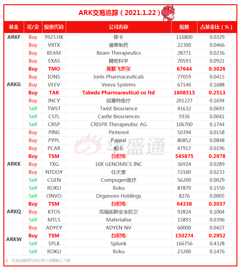 Takeda、Paypal、Veeva Systems、福泰制药等为ARK连续买入个股,可适当关注