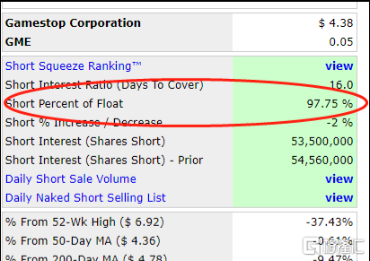 2020年,GameStop流通股做空率一度超过了90%,相当于差不多所有流通股全被空了一遍。FactSet更是援引最新文件称,GameStop已成为美股市场上被卖空最多的公司。