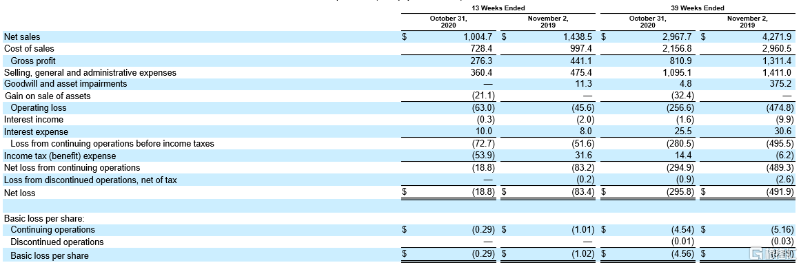 最新一份财报中,数据显示其2020年Q3净销售额为10.047亿美元,同比下降30.2%,低于市场预期;净亏损1880万美元,2019年同期净亏损为8320万美元;每股亏损为0.3美元,低于2019年同期1.02美元的基本每股亏损。
