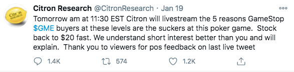 然而,多空双方维持的平衡终于被香橼的一条推特打破。1月19日,香橼在社交账号中表示,GameStop股票的买家是“这场扑克游戏中的输家”,其股价很快将回到20美元。