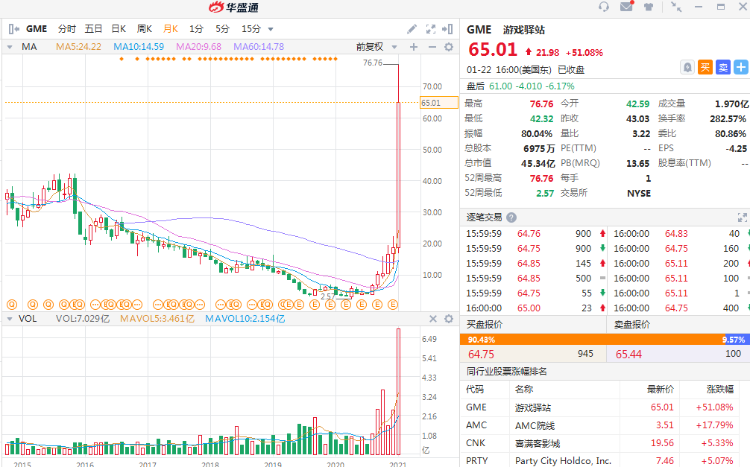 1月23日,GameStop暴力拉涨,截至收盘该股涨超51%,报65美元,盘中最高触及72.88美元。由于波动性过大,该股一度触及熔断。当天,GameStop的成交量超过1.97亿股,是其30天平均值2380万股的8倍。