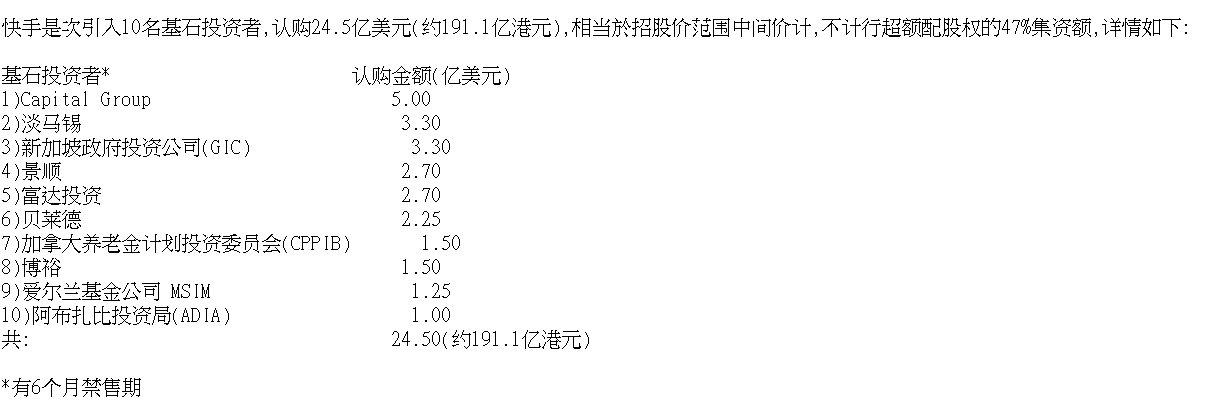 据汇港通讯,快手本次IPO将引入10名基石投资者,当中包括新加坡主权基金GIC、贝莱德、淡马锡、博裕资本及阿布达比投资局认购约24.5亿美元等值的股份,禁售期为6个月。
