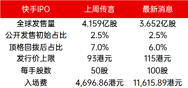 据香港信报最新消息,快手将在香港IPO中发行3.652186亿股股份,其中97.5%为国际配售,香港公开发售部分比例2.5%(顶格回拨后比例为6%),招股价区间为每股105-115港元(原来消息称招股上限为93港元),每手100股(原来传言50股),另有15%超额配股权。