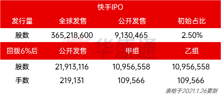 如消息称,快手全球发售365218600股,香港公开发售占2.5%,假设快手申购人数120万,公开发售超购倍数有望超过95倍,触发顶格回拨6%(原来传言是回拨7%),算出公开发售是21913116股(219131手)。