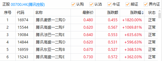 截至发稿,腾讯高盛一甲牛O(53959)涨超200%,腾讯麦银一二购D(16974)涨超1800%。