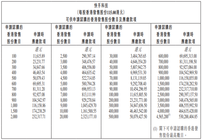 快手-W(01024):招股价105-115港元 入场费11616港元