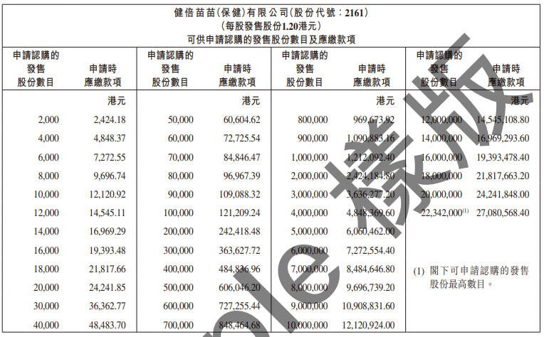 健倍苗苗(02161):每股发售价1.2港元,一手入场费2424.18港元