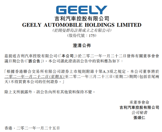 吉利汽车发布澄清公告,公司拟于3月23日召开股东会,公布公司年度业绩。公司表示,公司董事将于1月23日至3月23日不能买卖公司股票。不过,公司今日晚间澄清,公司于1月22日至3月23日不能买卖公司股票。