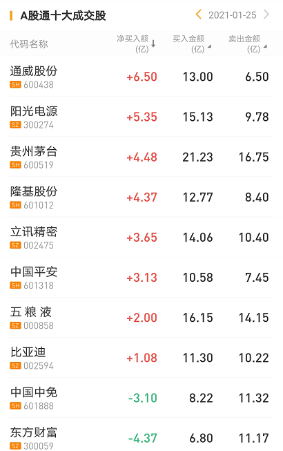 北上资金今日净买入通威股份6.5亿元,为今日买入之最。此外,北上资金今日净买入阳光电源5.35亿元。