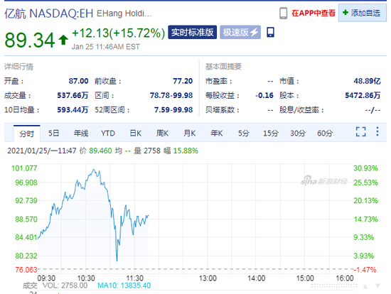 亿航智能(EH)上涨15.7%,报89.34美元。盘中一度最高上涨29.46%。