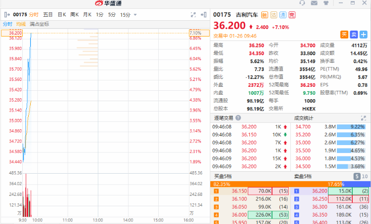 1月26日消息,吉利汽车涨超7.1%,媒体称,法拉第未来将在中国生产纯电动汽车,并聘请吉利进行代工。