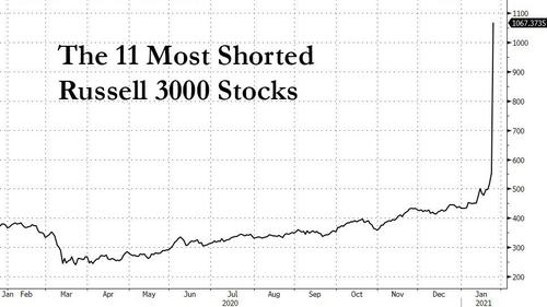 零对冲还指出,除了GME之外,几乎所有被做空最严重的股票都在昨晚都上演了爆发,罗素3000指数中11家空头净额占股票流通量50%以上的公司都飙升到了纪录高位。罗素1000指数中做空最多的股票在1月份到目前为止已经上涨了约12%。