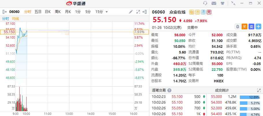 华盛资讯1月26日消息,众安在线早盘走高,一度涨逾7%,最高见56港元。截至发稿,众安在线涨7.93%,现报55.15港元每股,当前成交额4.983亿,总市值为810.6亿港元。