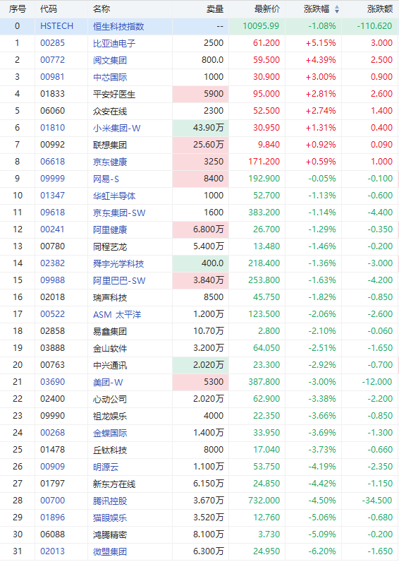 热门科技股,京东、阿里则跌超1%,美团跌3%,腾讯、明源云跌超4%,微盟集团跌超6%。