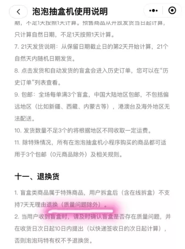 事实上,泡泡玛特退货难的问题并不是新鲜事。《中国消费者报》近期曾报道,泡泡玛特对问题产品拒不退货涉嫌霸王条款。由于泡泡玛特等盲盒产品的特殊属性,盲盒产品可不适用于《消费者权益保护法》第二十五条规定的“七日无理由退换”。但泡泡玛特规定“如有质量问题15天内包换”的条款,如果事先没有与消费者进行充分协商达成一致,只是单方面拟出,事实上已经涉嫌免除了自己退货的责任,同时也排除了消费者退货的权利,该条款涉嫌霸王条款。