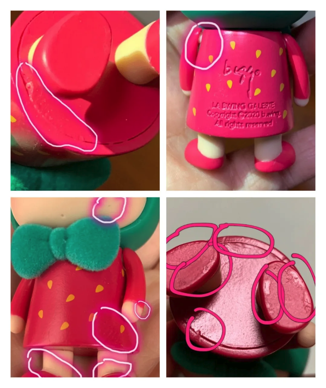 从小瑞发的图片来看,娃娃确实存在鞋子上色不均、裙摆缝隙不匀、手臂连接不紧、头部有划痕、裙底不平整甚至缺损等诸多问题。