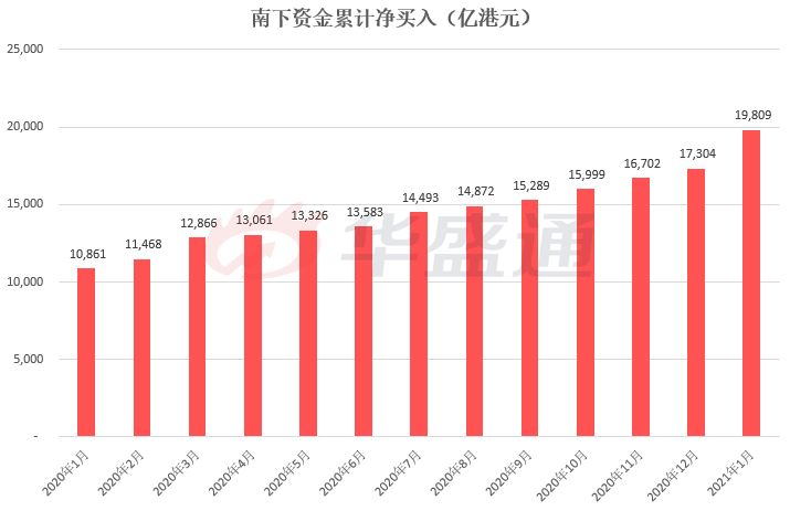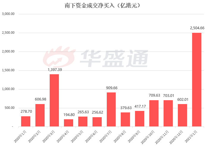 这是什么概念呢?在2020年初至2020年12月31日,南向资金净买入港股金额为6721亿港元,也就是说2021年开年的短短16个交易日南向净买入金额已达2020全年总额的37%!按照这个净流入的速度,在2021年一季度结束南下资金就有望完成去年全年的流入规模。