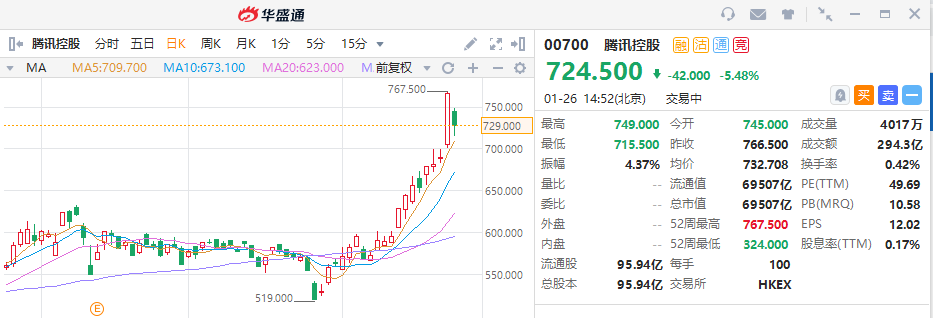 获得南下资金最为青睐的腾讯,股价表现也没让人失望。在2021年1月25日腾讯一度股价触及历史新高的767.5港元,市值超过73000亿港元,尽管1月26日腾讯股价有所回调,但当月累计涨幅依然超过28%。