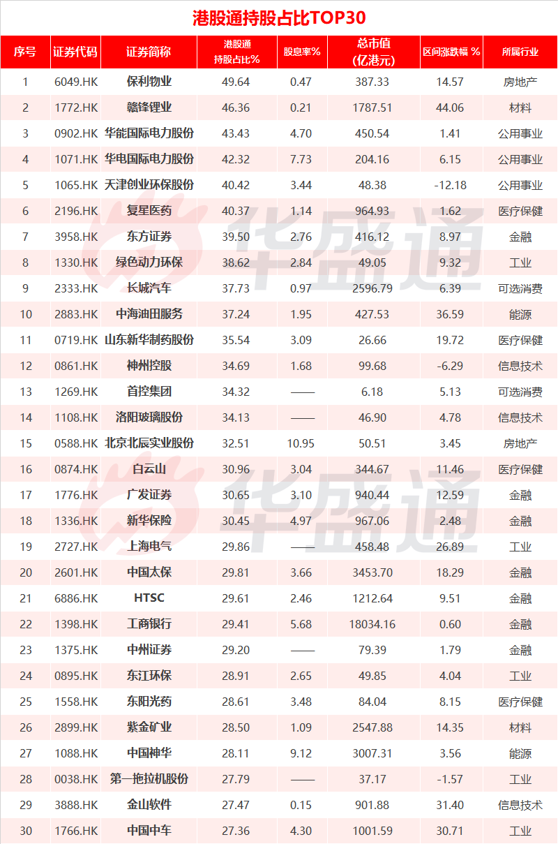 根据统计,港股通持股占比市场最高的30只个股如下,其中物业管理服务巨头保利物业、受益于新能源车上行周期的锂资源巨头公司赣锋锂业以及公用事业股华能国际电力排名前三,港股通资金对它们的持股都有在40%以上。