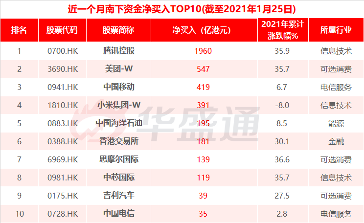 经过数据统计截至1月25日,近一个月南下资金净买入港股标的前十榜单中,腾讯控股、美团-W、中国移动获得前三的宝座。