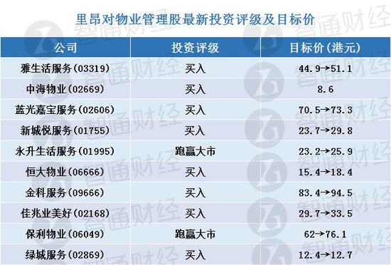 里昂发布研究报告称,普遍上调物管股目标价,将雅生活服务(03319)目标价由44.9港元升至51.1港元,维持“买入”评级,升蓝光嘉宝服务(02606)目标价由70.5港元升至73.3港元,评级“买入”,将新城悦服务(01755)目标价由23.7港元升至29.8港元,评级“买入”。
