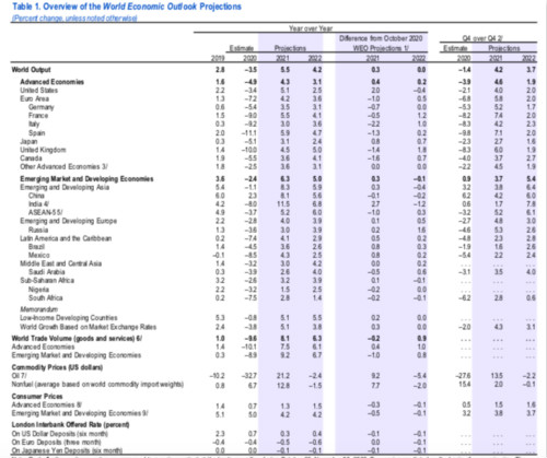 在1月WEO中,IMF预计,2021年全球经济增速将为5.5%,比去年10月的预估上调了0.3个百分点。其维持了对2022年全球经济增速4.2%的预期不变。
