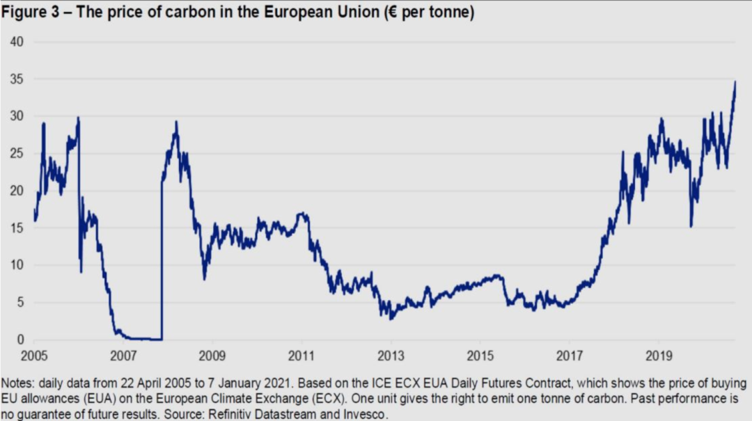 气候变化是最终的外部原因,我们认为通过定价机制内化问题将发挥重大作用。欧盟碳补助计划就是这样的一个解决方案,其中,碳排放权可以用作买卖,从而让市场来制定最有效的减排方式(补助数量随着时间推移而逐渐减少)。