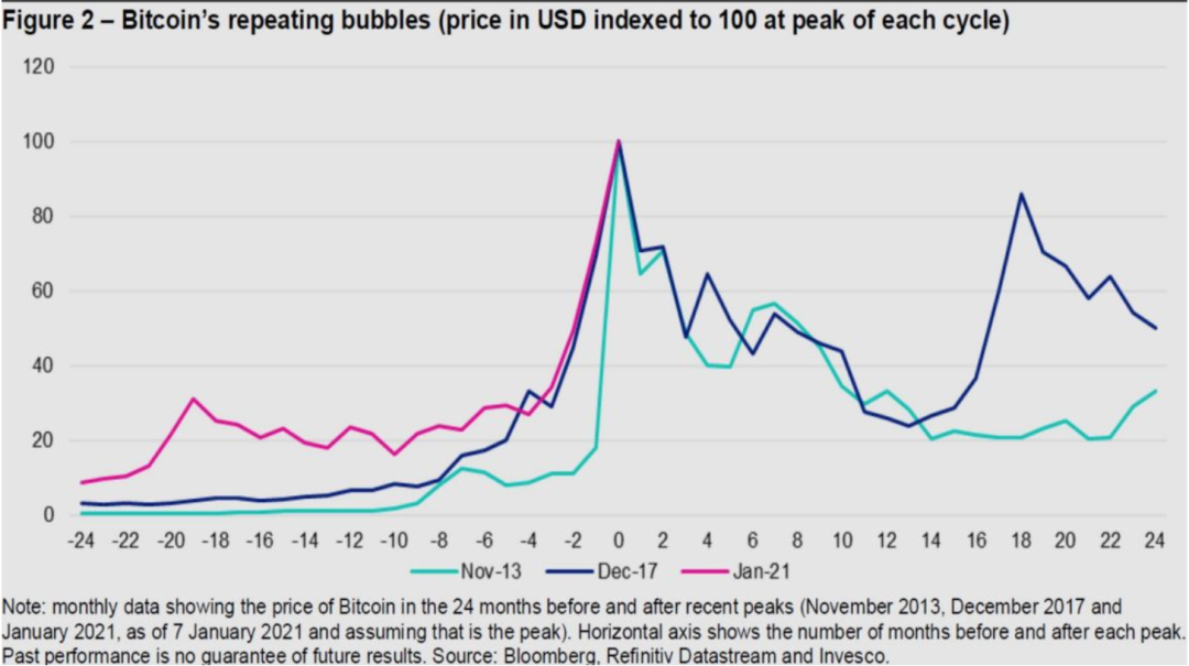 下图对比了最近一次的比特币泡沫,表明当泡沫来临时,可能出现剧烈下跌(假设比特币现在正见顶)。我们很有可能看到比特币价格在2021年的某一阶段跌破10000美元。