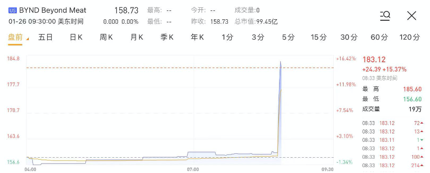 华盛资讯1月26日讯,Beyond Meat盘前涨超15%,公司将和百事(PEP)建立合资企业。