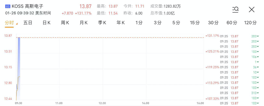华盛资讯1月26日讯,高斯电子开盘暴涨超130%!截止发稿,高斯电子大涨131.17%,现报13.87美元,当前总市值约1亿美元。
