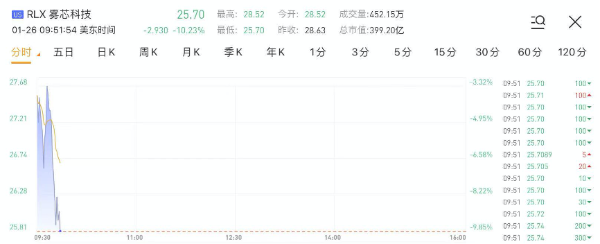 华盛资讯1月26日讯,次新股雾芯科技开盘大跌超10%。