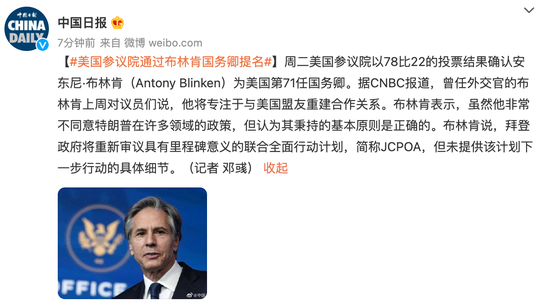 【#美国参议院通过布林肯国务卿提名#】周二美国参议院以78比22的投票结果确认安东尼·布林肯(Antony Blinken)为美国第71任国务卿。据CNBC报道,曾任外交官的布林肯上周对议员们说,他将专注于与美国盟友重建合作关系。布林肯表示,虽然他非常不同意特朗普在许多领域的政策,但认为其秉持的基本原则是正确的。布林肯说,拜登政府将重新审议具有里程碑意义的联合全面行动计划,简称JCPOA,但未提供该计划下一步行动的具体细节。(记者 邓彧)