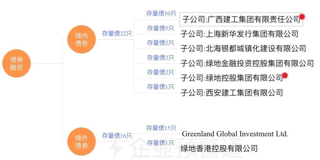 此外,绿地控股境内的参、控股子公司也存续155.27亿元的债券。其中,广西建工集团有限责任公司的债券规模最大,为77.85亿元;其次是绿地控股集团有限公司、上海新华发行集团有限公司、北海银都城镇化建设有限公司、绿地控股金融投资控股集团有限公司、西安建工集团有限公司,存续规模分别为26亿元、20.2亿元、16.2亿元、9.62亿元和5.4亿元。