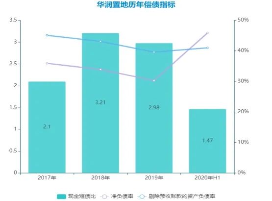 于2020年6月30日,华润置地净负债率45.9%,剔除预收账款的资产负债率41%,现金短债比1.47。