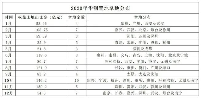 据不完全统计,华润置地2020年新进入嘉兴、义乌、济宁、绍兴4个城市,在一二线及强三线城市拿地占比达到90%。
