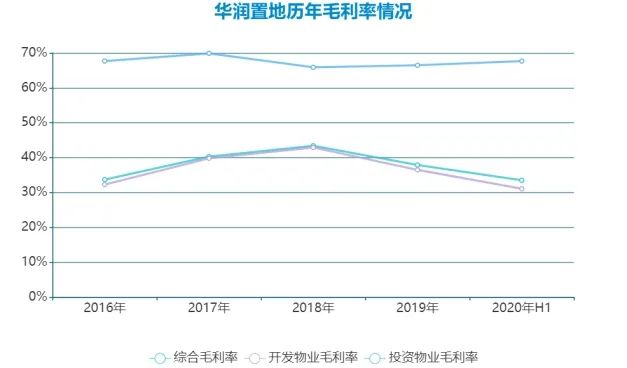 从数据可窥见,华润置地投资物业毛利率一直在65%以上,开发物业毛利率下探趋势明显。2020年上半年综合毛利率为33.5%,较2019年末减少4.4个百分点,背后主因是开发业务毛利率下降导致。