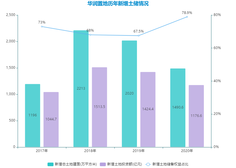 2020年,据观点指数发布的1-12月中国房企新增土地储备报告显示,华润置地全年新增土地储备面积为1490.6万平方米,新增权益面积为1176.6万平方米,对应权益比例约为78.9%。