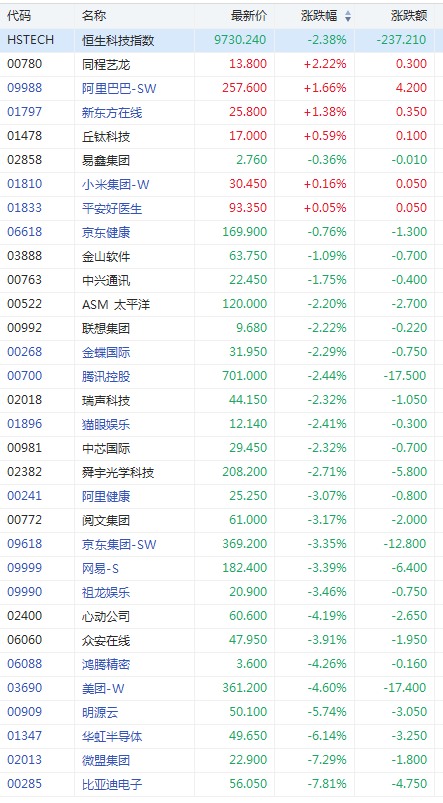 1月27日消息,恒生科技指数跳水大跌2.38%,微盟、比亚迪电子跌超7%,华虹半导体跌6%,明源云跌5%,美团跌4%,京东集团等跌超3%。