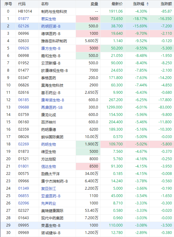 华盛资讯1月27日消息,生物制药股今日普遍下挫,其中医药B类股更是全线走跌。截止发稿,君实生物跌超17%,此前一度跌20%;药明巨诺跌超15%,德琪医药、康方生物跌超9%,嘉和生物、云顶新耀跌超8%,欧康维视生物、泰格医药跌超7%,康希诺生物跌超6%,康龙化成、百济神州跌超5%,药明生物跌超5%、信达生物跌超4%。