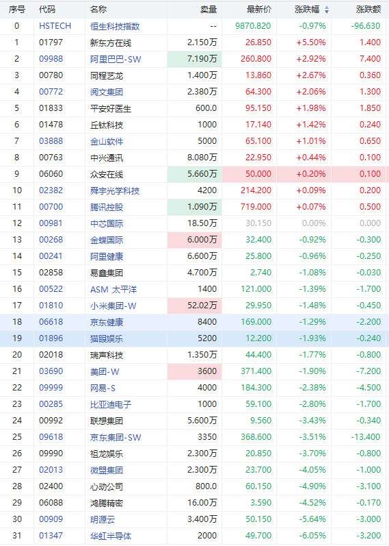 美团跌近2%,京东跌超3%,明源云跌超5%,华虹半导体跌超6%。