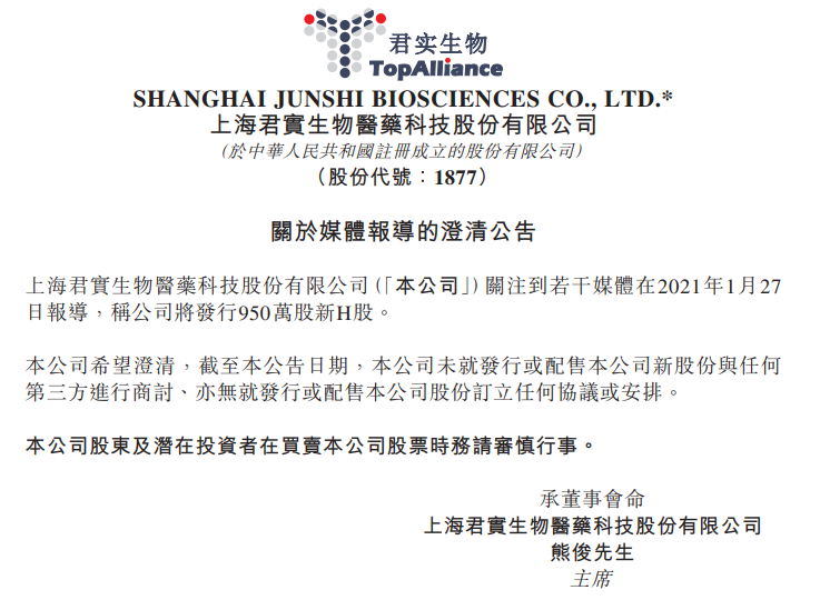 1月27日消息,君实生物在港交所发布澄清公告称,截至本公告日期,未就发行或配售本公司新股份与任何第三方进行商讨、亦无就发行或配售本公司股份订立任何协议或安排。