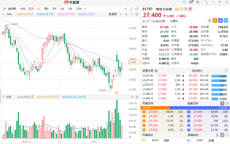 智通财经APP获悉,公布2021财年上半年业绩后,在线教育公司新东方在线(01797)获得公司首席执行官孙东旭的增持。根据联交所最新权益披露资料显示,1月25日孙东旭购入146.8万股,每股均价为26.36港元,持股比例进一步扩大。截至13时27分,涨7.66%,报价27.4港元,成交额1.873亿。