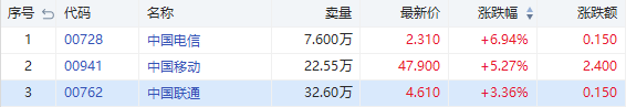 华盛资讯1月27日消息,港股三大通信运营商股价接连多日下挫,今日终于止跌迎来反弹。截至发稿,中国电信涨6.94%,现报2.31港元;中国移动涨5.27%,现报47.9港元;中国联通涨3.36%,现报4.61港元。