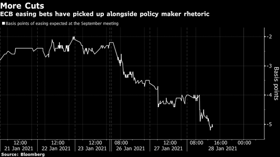 因所谈内容未公开而不愿具名的官员们表示,欧洲央行管理委员会上周讨论了市场定价情况,定价显示市场预期负利率进一步下调的可能性微乎其微,该委员会同意有必要强调进一步下调的可能性。当前市场预期是到2021年9月将降息5个基点。