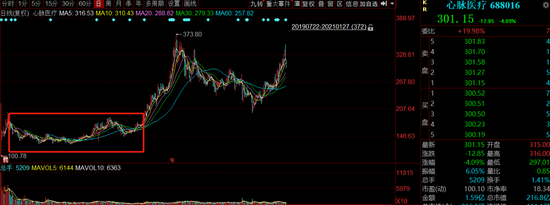 心脉医疗的股价也在上市的一轮短暂上涨后,迎来了长达两年半的持续萎靡。直到2020年4月,心脉医疗才迎来了自己的行情,一路突破新高,最高触及373.8元每股,截至2021年1月27日,市值达到了216.8亿元人民币。